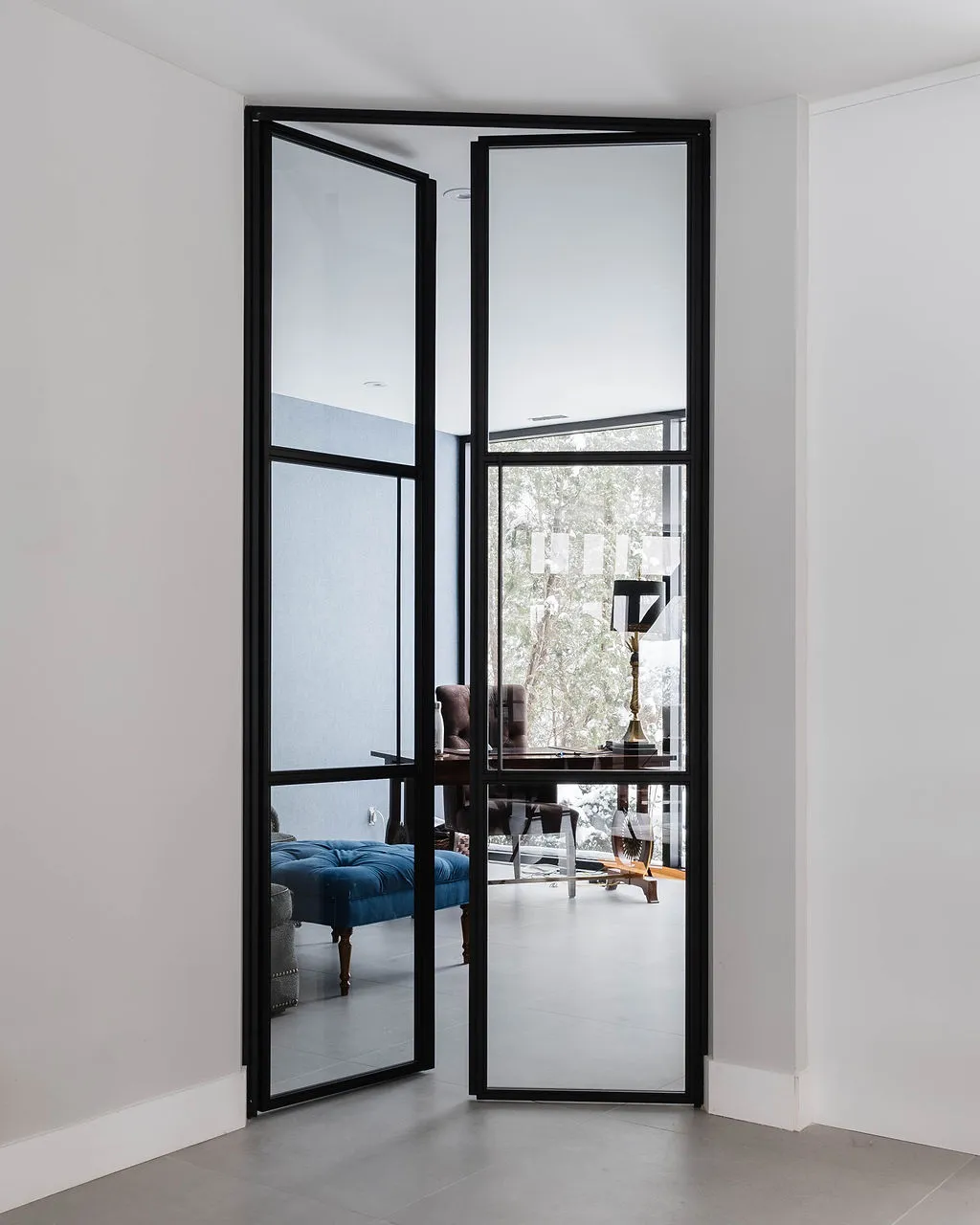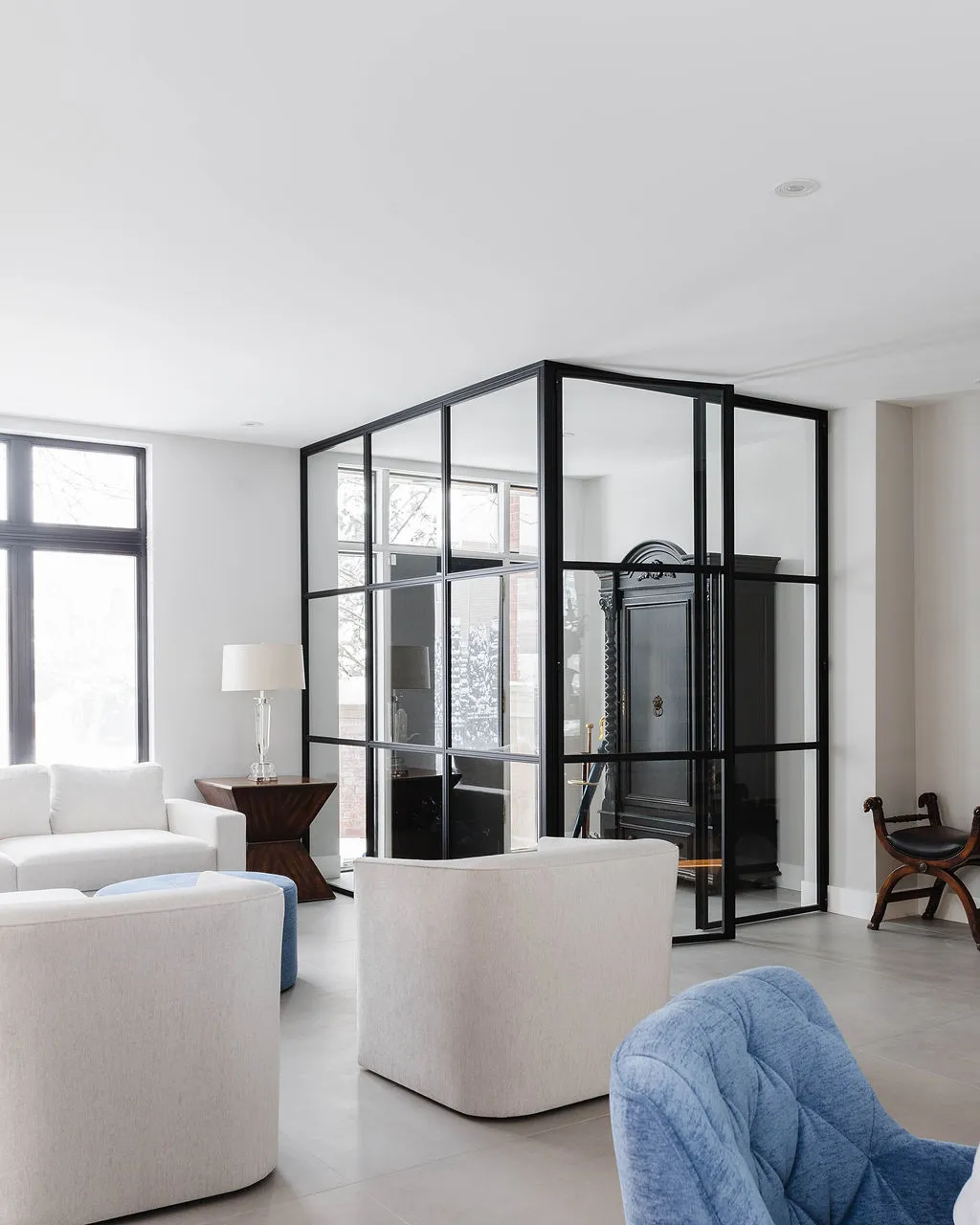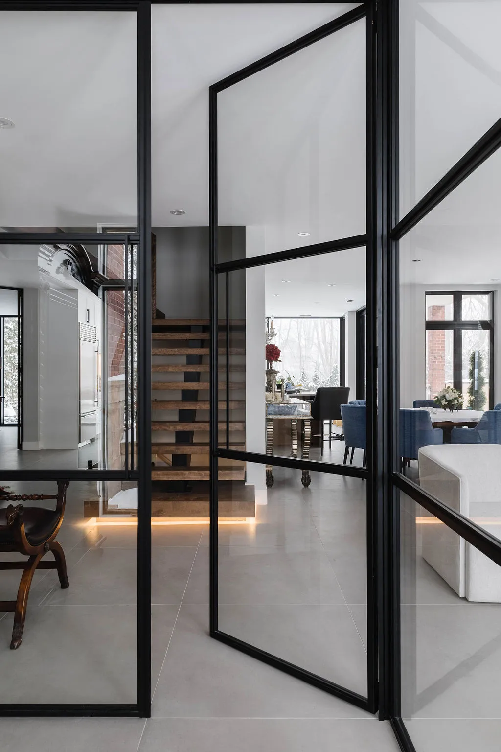 This entrance, decorated with a magnificent corner glass partition, sets the tone for this splendid residence. We also find double doors to create aesthetic continuity in the interior design.