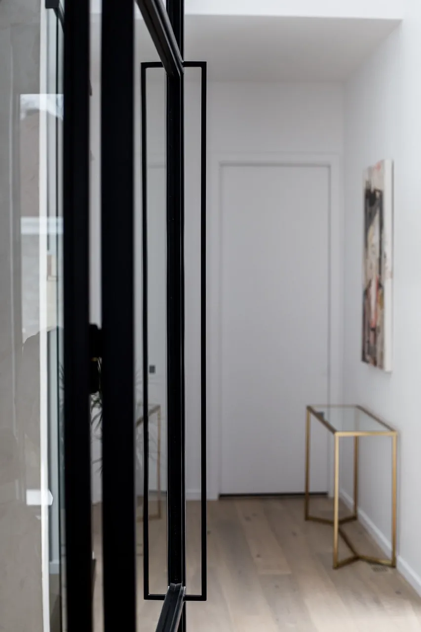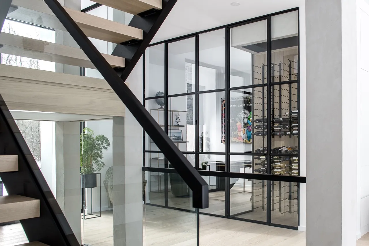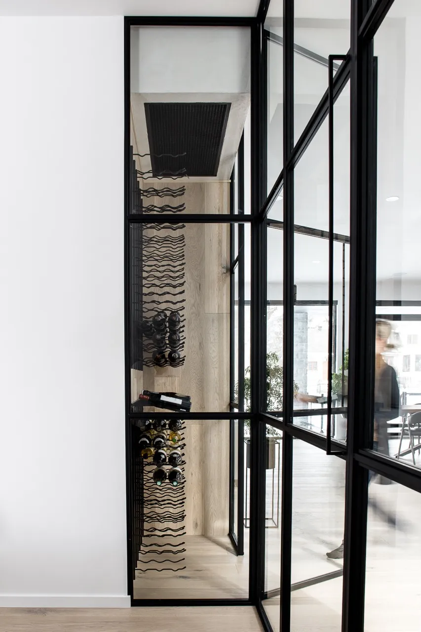 Dès que l'on franchit le seuil de cette demeure, l'immense fenestration évoque instantanément un sentiment agréable de bien-être. La lumière abondante inonde chaque recoin de l'espace, créant une atmosphère chaleureuse et accueillante. La verrière joue un rôle double, séparant élégamment le bureau tout en délimitant le cellier sur-mesure. Une alliance parfaite entre la luminosité naturelle et le design fonctionnel.
