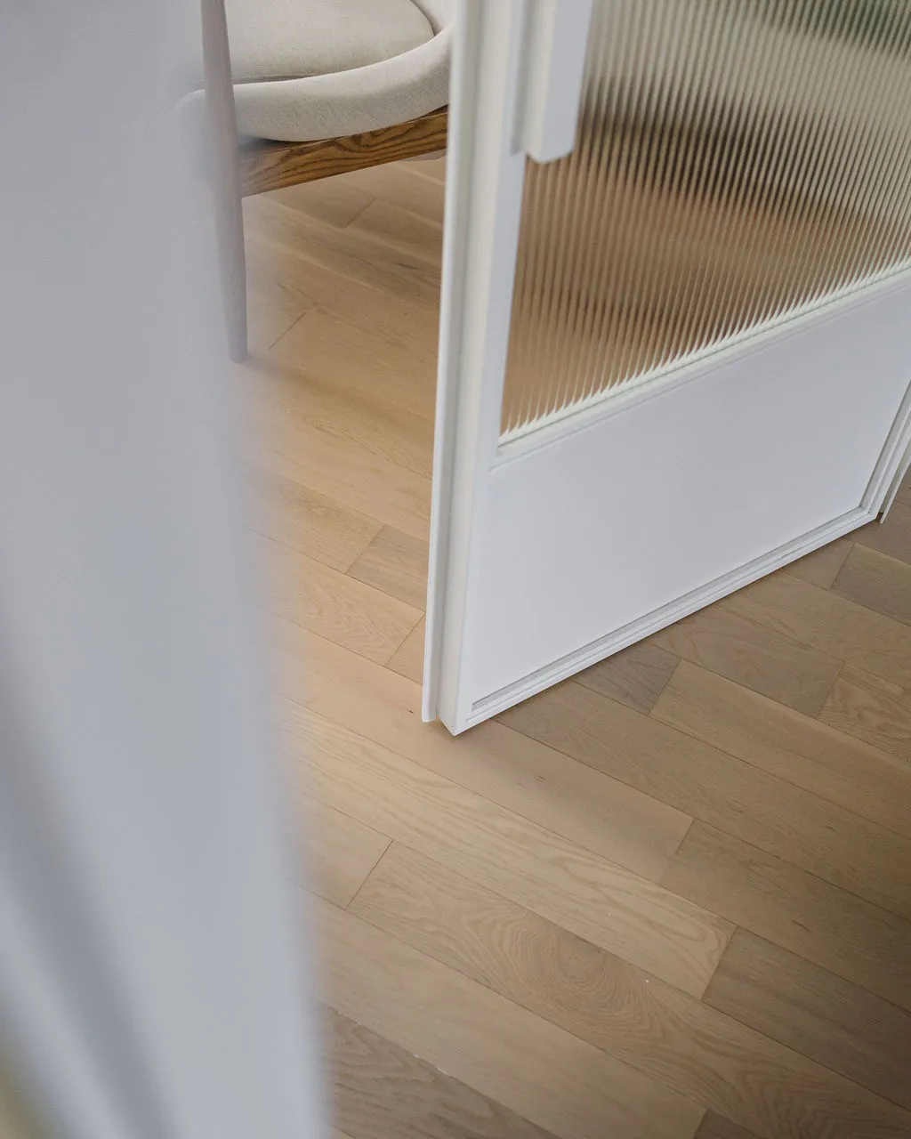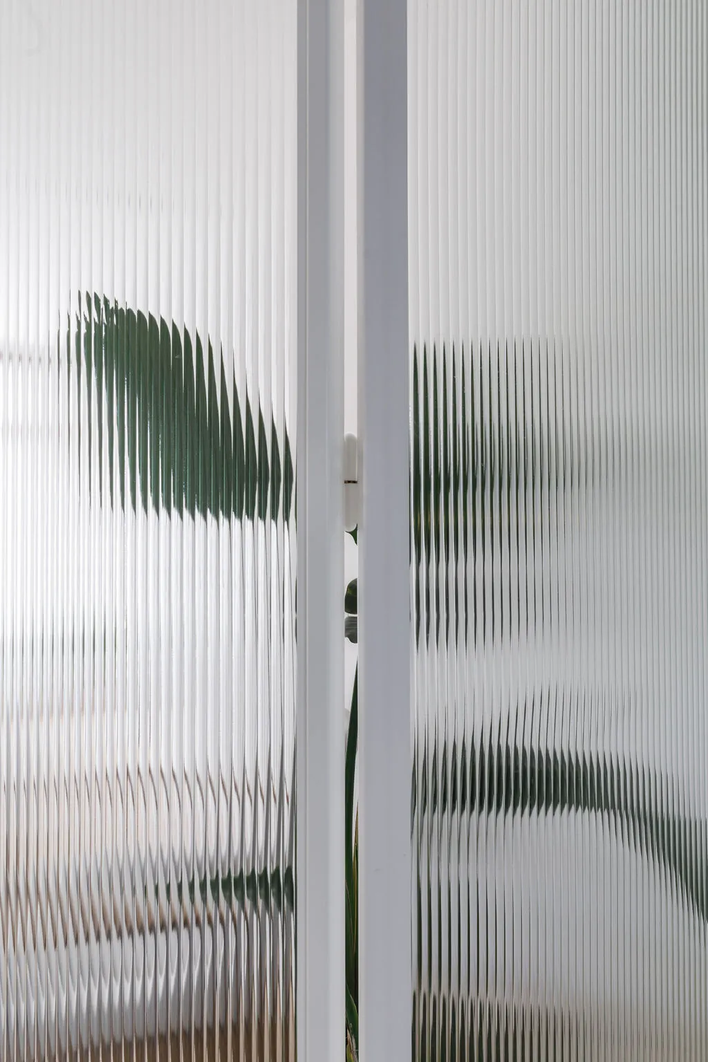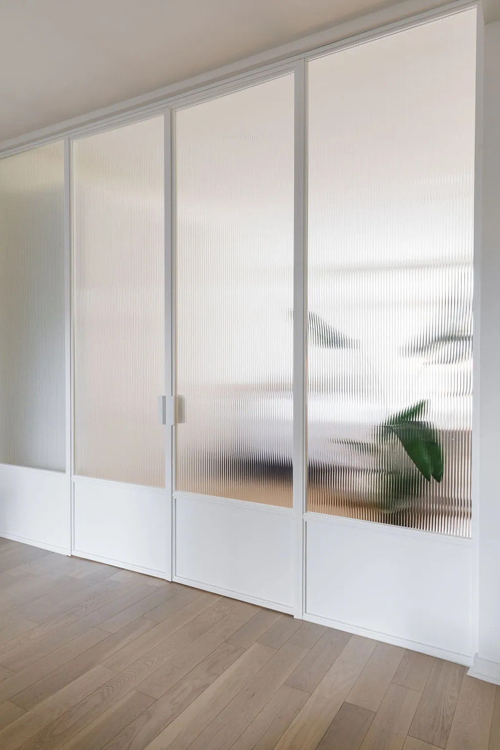 Un projet tout en lumière. Le blanc de cette verrière procure une légèreté à l'espace. La division est davantage créée par le verre que par l'acier. Ce verre texturé apporte intimité sans brimer la luminosité qui circule.
