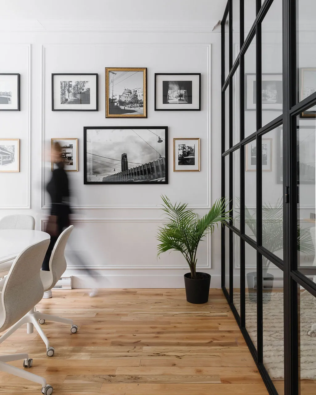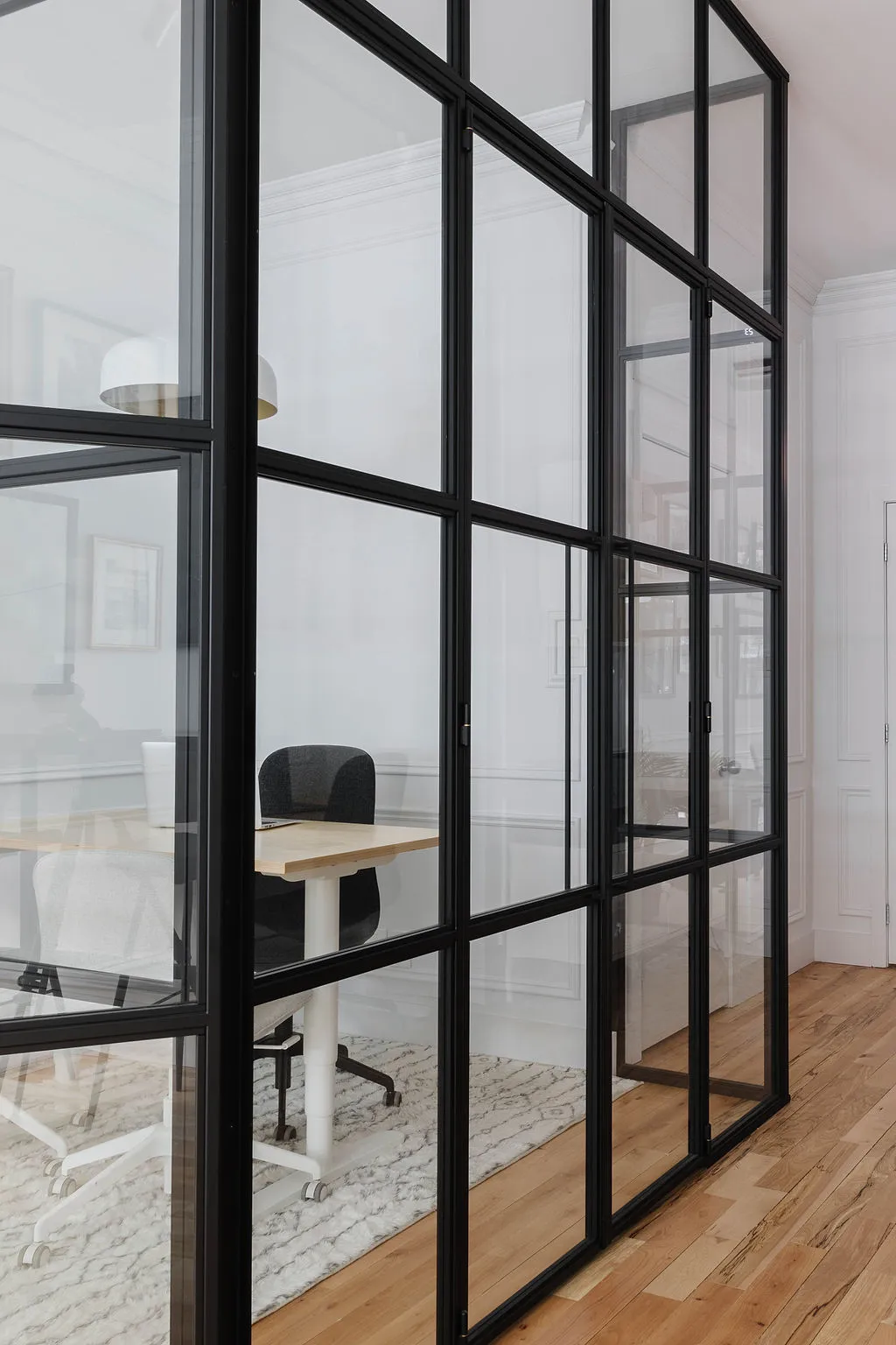 Dans ces locaux dédiés au courtage immobilier, une fusion habile de verrières imposantes a été réalisée pour préserver la confidentialité tout en baignant les lieux de lumière naturelle. Cette harmonie entre discrétion et luminosité crée un équilibre subtil entre fonctionnalité et esthétique. Une réponse optimale pour une entreprise qui accueille fréquemment des clients, offrant ainsi une expérience alliant praticité et élégance.