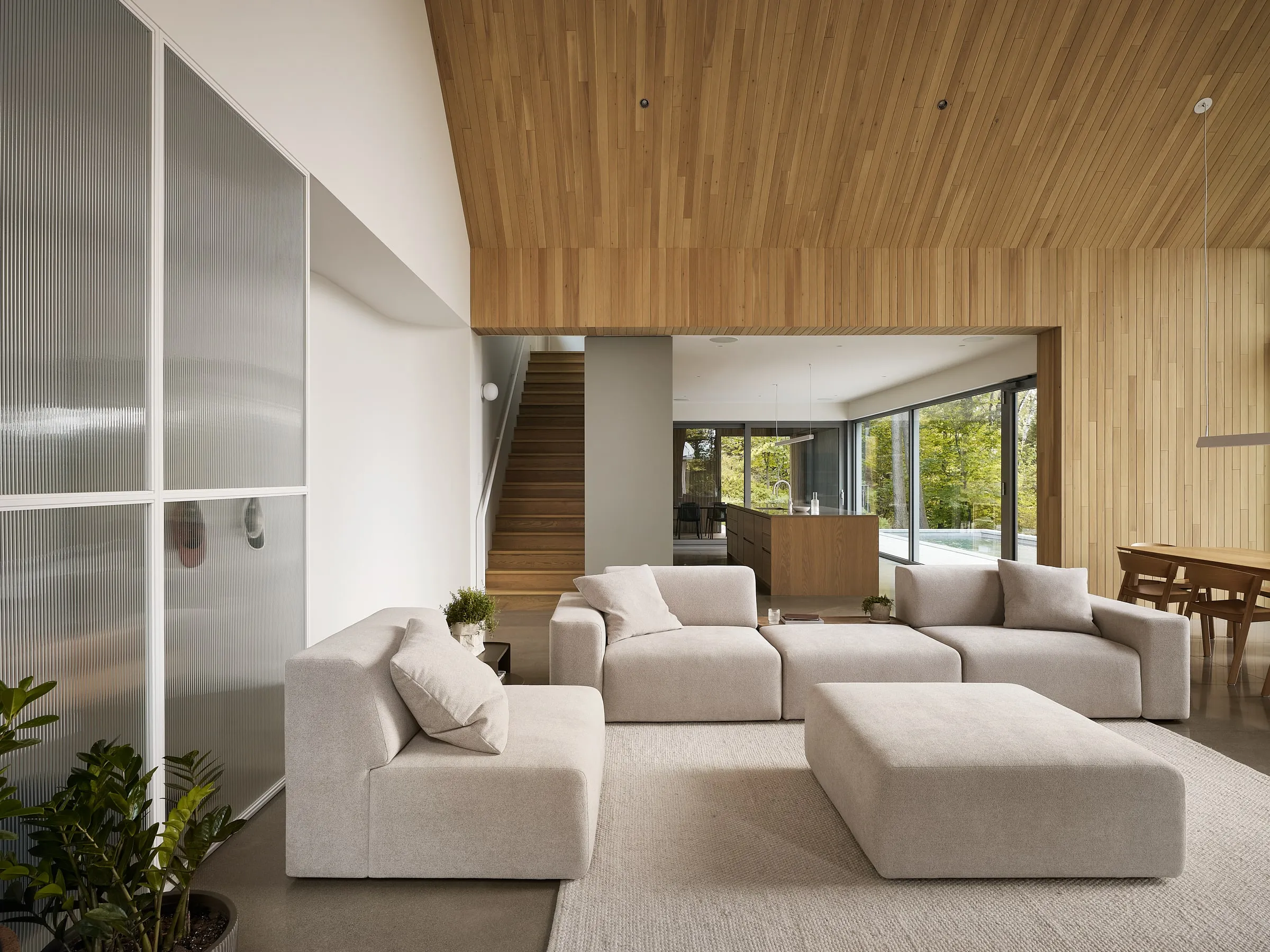 La verrière d'entrée s'insère avec élégance et fonctionnalité dans l'aire ouverte du vestibule, contribuant ainsi à créer une transition harmonieuse et fluide entre les espaces intérieurs.