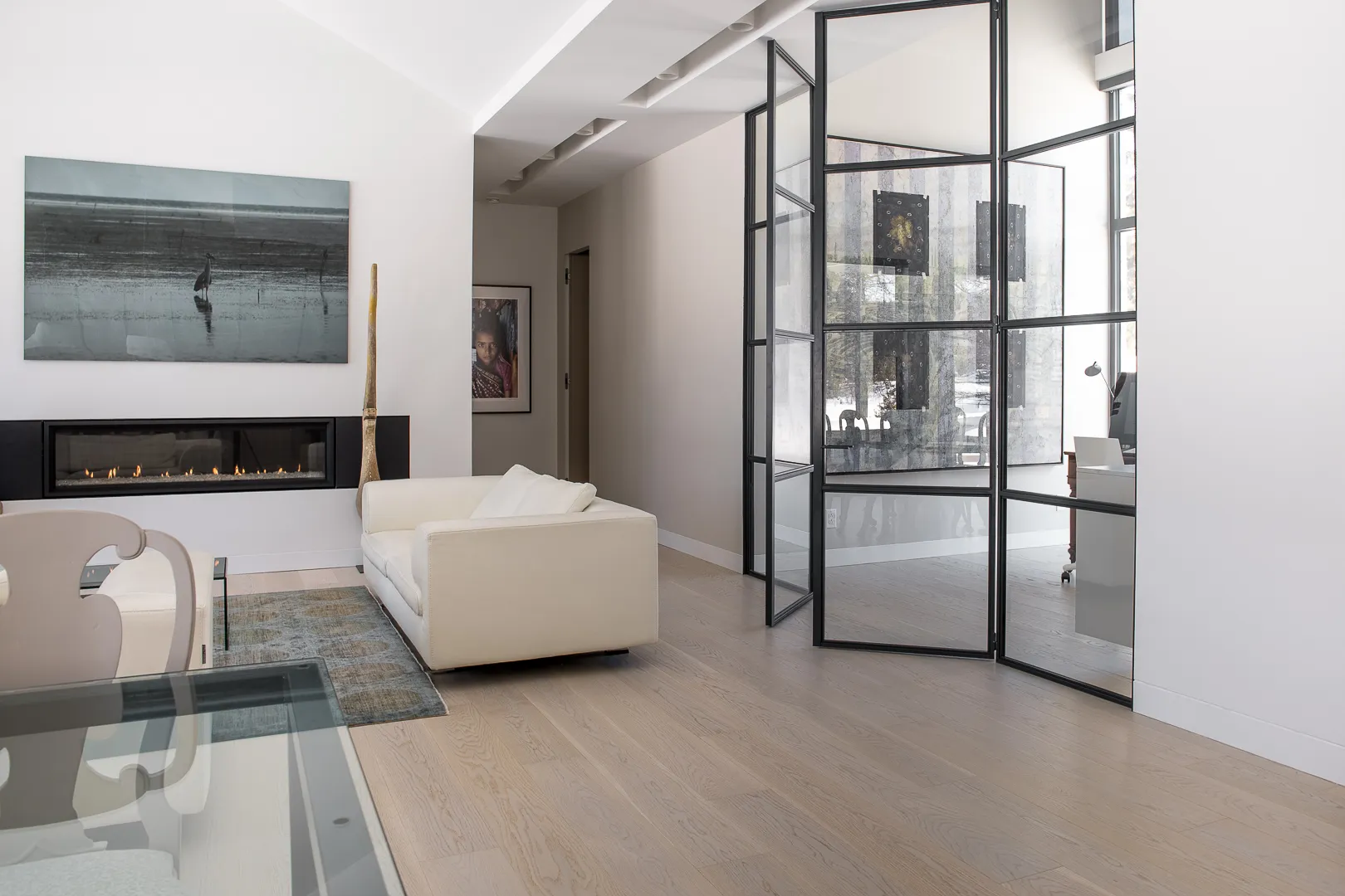 Cette demeure est un réel havre de paix. Doux, calme et intégré à une nature majestueuse, ce vaste espace intérieur profite pleinement d'une communication visuelle entre les pièces. Pourquoi ne pas profiter du foyer alors qu'on est dans le bureau? Les divisions architecturales COSTAL permettent de séparer l'espace bureau de l'aire commune et ce, toujours dans un esprit communicatif entre les différents espaces de vie.